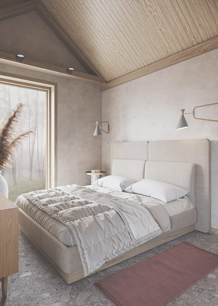 to decorating is both modern and minimal, yet there's nothing cold or impersonal about it. The warm finishes and soft furnishings make this a great room for spending a cozy night in.